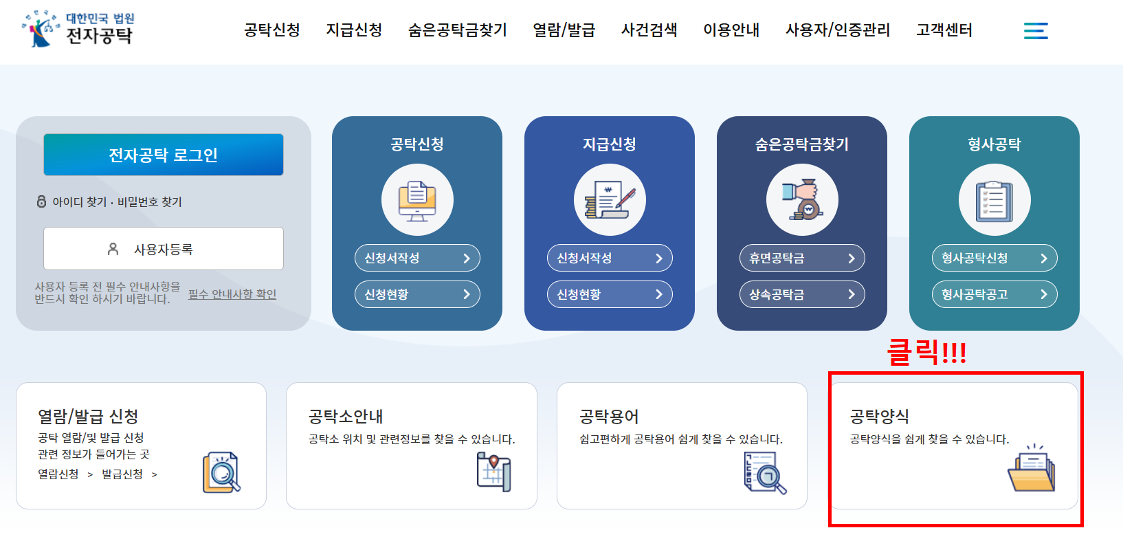 - 메뉴 중간 오른쪽 ‘공탁양식’ 선택