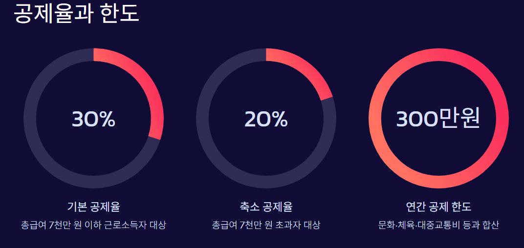 연간 공제 한도는 기존 문화·체육·대중교통비 등과 합산해 300만 원까지 인정됩니다.