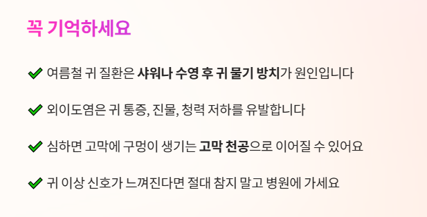 ✔ 여름철 귀 질환은 샤워나 수영 후 귀 물기 방치가 원인입니다