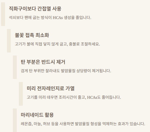 - 직화구이보다 간접열 사용: 석쇠보다 팬에 굽는 방식이 HCAs 생성을 줄입니다.