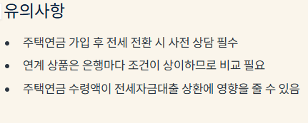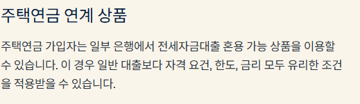 - 주택연금 가입자는 일부 은행에서 전세자금대출 혼용 가능 상품을 운영 중이며,