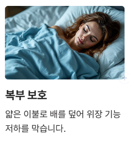 얇은 담요나 이불로 배를 덮고 주무세요. 위장 기능 보호에 효과적입니다.