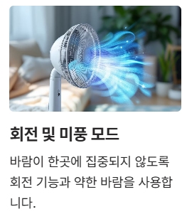 - 선풍기만 사용할 경우에는 가습기나 젖은 수건으로 실내 습도 보완 필요
