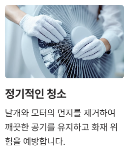 선풍기 날개, 모터 내부 먼지를 반드시 제거하세요.