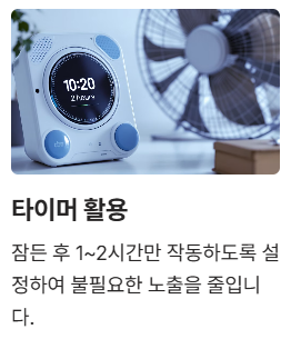 이와 달리 선풍기의 부작용은 직접적인 냉기 노출에 의한 국소적인 신체 기능 저하가 주요 원인이며, 타이머와 회전 기능을 활용하면 대부분 예방 가능합니다.