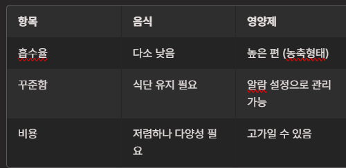 흡수율 | 다소 낮음 | 높은 편 (농축된 형태) |
