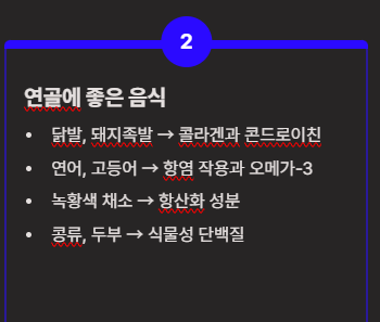 - 닭발, 돼지족발 → 콜라겐과 콘드로이친 함유